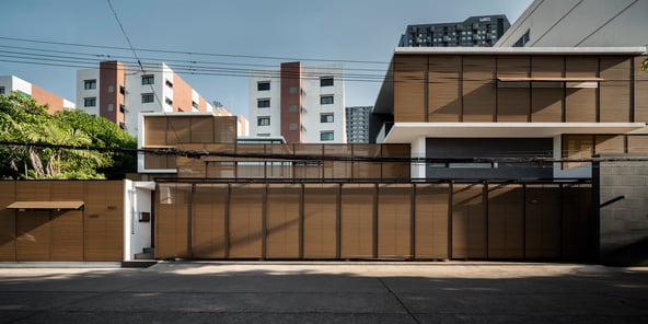 If ever a house showcases the ability of louvres to maintain occupant privacy and control solar gain, it is this (though we like to think The Hills Lodge did a decent job of it too). Situated in a busy area of Bangkok's eastern suburb, between the business district and a residential area, it hides a family home without making it feel like a fortress inside, that is completely shut off. We imagine the shade from the relentless sun is quite nice too.